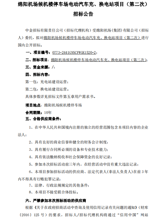 綿陽(yáng)機(jī)場(chǎng)候機(jī)樓停車場(chǎng)電動(dòng)汽車充、換電站項(xiàng)目(第二次)招標(biāo)公告